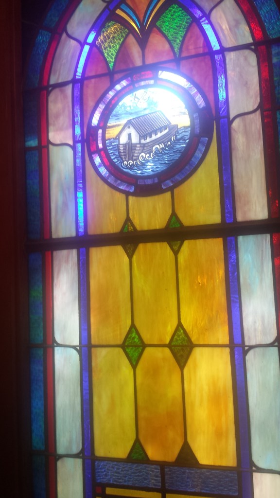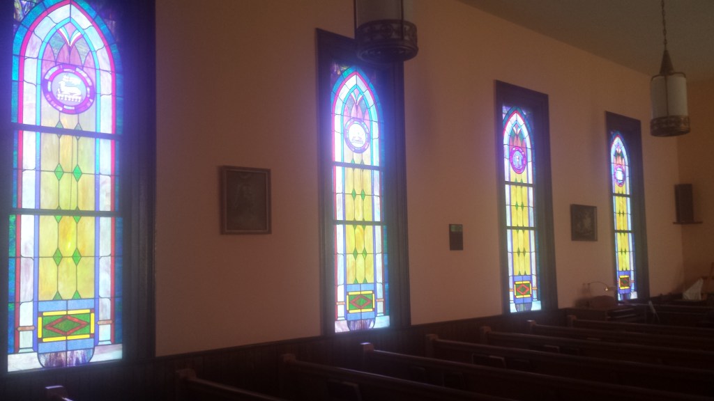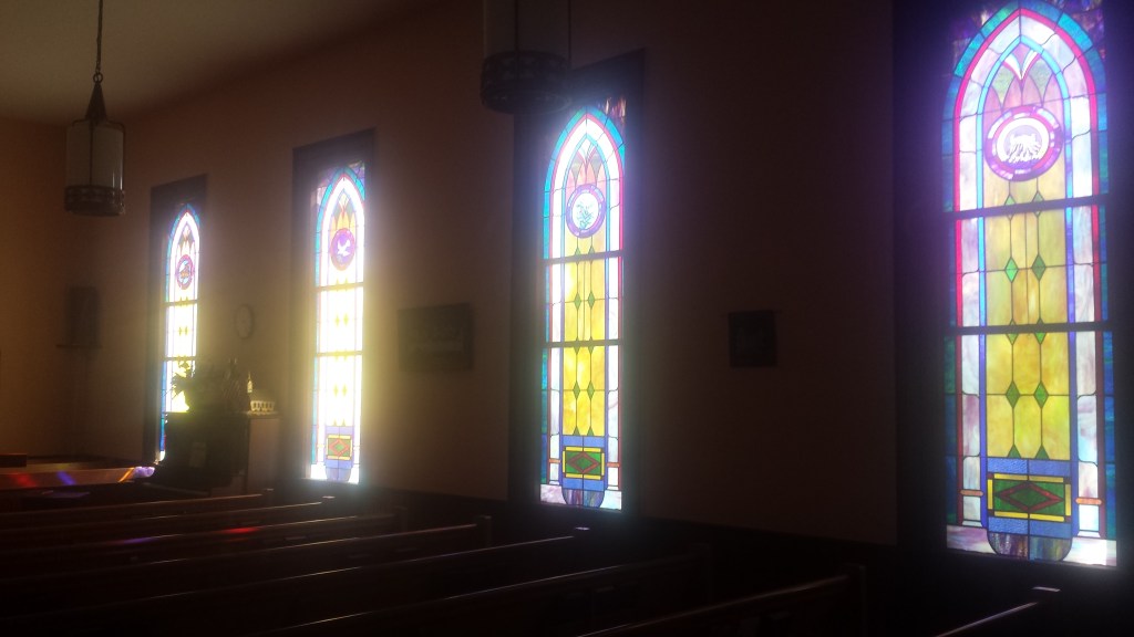 There was a bell in that belfry back in the day. It had a rope to pull and make the bell ring. Us kids got to do that sometimes. The church had the most beautiful stained glass windows that cast a beautiful light through the space.