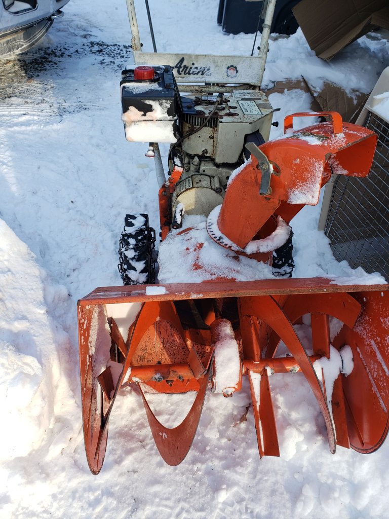 We picked this late 1960’s (either 1967 or 1968) Ariens snowblower up for free through Freecycle on Long Island. The owner told me it needed a new carb – that would not really be a surprise. The first thing I found was that the throttle cable was completely frozen and would not move. A little PB Blaster, oil, and CRC Lithium Grease, it works pretty good. I then checked for spark and found no spark at the plug. I did a little research on the snowblower and then on how to remove the flywheel to get to the points and was able to check the points. They were a mess and needed to be filed down quite a lot so I managed to get that done, put it all back together, checked for spark again and whoohoo, it worked. I had spark. I took the carb bowl off and everything looked clean so I decided to try to fire it up. It took quite a few pulls but I got it working!