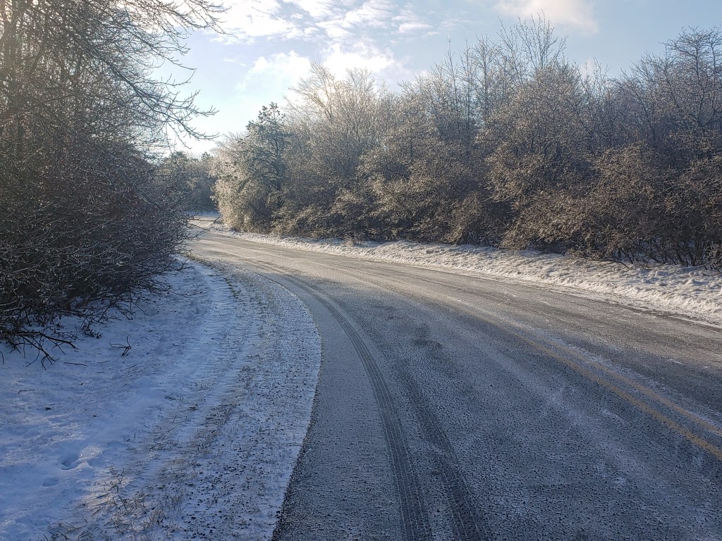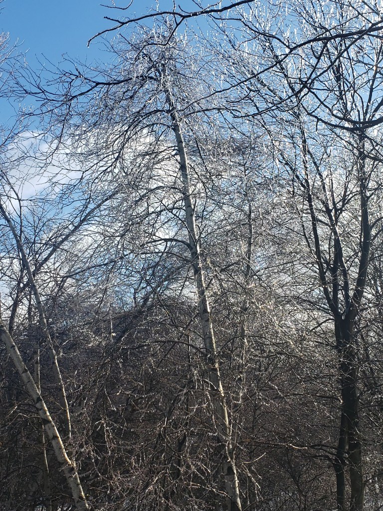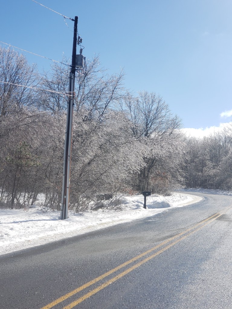 Cold day out there this morning. Had rain and freezing rain yesterday that coated the trees so everything is covered with ice this morning. When I walked the dogs this morning and took this picture, I believe the temperature was around 10 with a wind chill bringing the temp to around -6. It has been colder. There’s been snow on the ground since it snowed weeks ago and the weather does not warm up enough to melt much of it. We had a couple of days slightly above freezing just prior to this ice but it melted everything just enough to cause a huge mess.